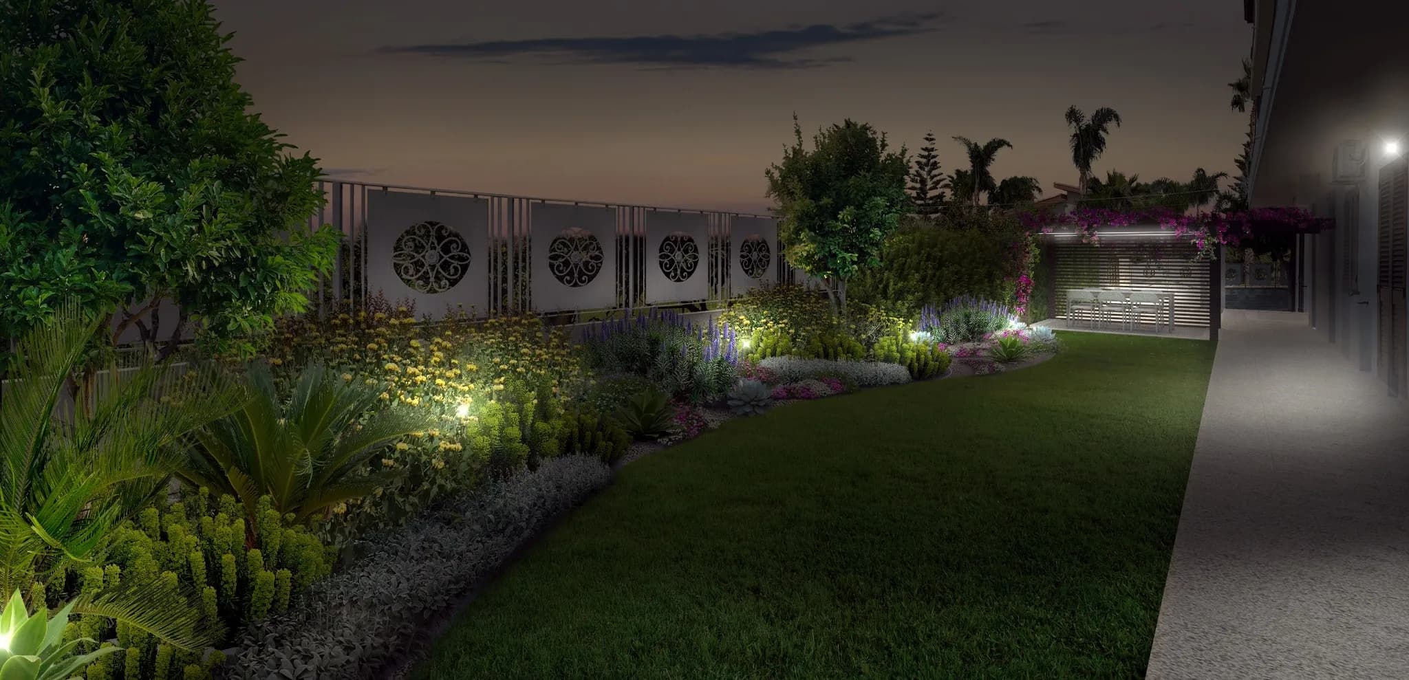 Il giardino residenziale senza barriere è progettato per un'esplorazione senza ostacoli, utilizzando pavimentazioni in legno WPC, grès e ghiaia. Include una zona pranzo con fioriere in resina, un'area living con solarium e una cucina all'aperto. L'illuminazione a LED esalta la bellezza del giardino, mentre la vegetazione varia e sempreverde offre fioriture abbondanti tutto l'anno.